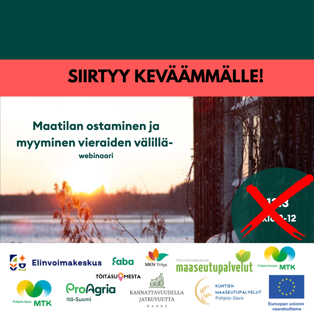 Webinaari sopii sekä ostoa harkitseville tai myyntiä suunnitteleville sekä kaikille, jotka haluavat ymmärtää tilakauppojen käytäntöjen vaiheet. Tilaisuudessa maatilan rahoitusnäkökulmaa avaa Säästöpankkiiri/asiakkuuspäällikkö Petri Lappi Säästöpankki Optiasta. Muut puhujat tarkentuvat myöhemmin.