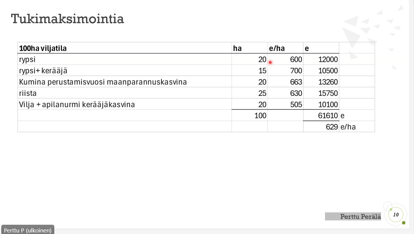👉Tilalla suunnitteluun vaikuttaa mm. maankasvukunto (hiilensidonta, rakenne), lämpösumma, hintasuhteet, tukieurot. Tekemällä tukimaksimointia, esimerkiksi kylvämällä kerääjäkasvit kaikille lohkoille mille voi jää aina vähintään 40 e/ha plussalle. Muista hyviä tilatason ratkaisuja olisivat esim. rypsi+ herne ja viherlannoitus. Kylvä maanparannus ja saneerauskasveja, riistapeltoja.