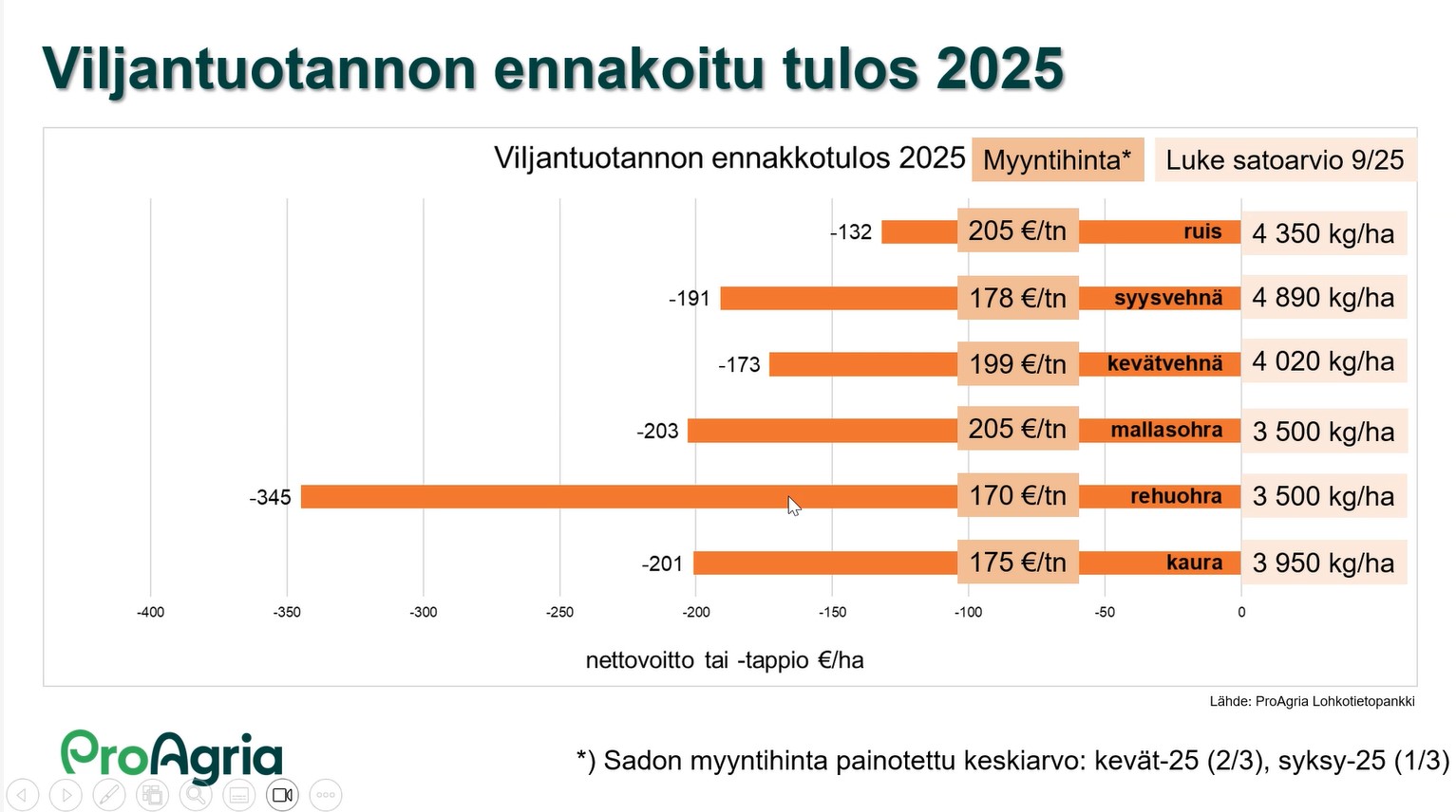 Tilaisuudessa kuultiin edellisten kasvukausien madonluvut Sari Peltosen, ProAgria, suulla, jonka mukaan kaikki tavisviljat olivat miinuksella eli tuottivat nettotappiota (vuosina 2025-2024). Vain luomukaura ja osa erikoiskasveista ylsivät plussalle.