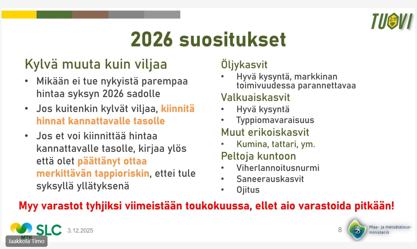 Timo Jaakkolalta MTK:n Tuovi-hankkeesta tuli sama viesti 3.12.tilaisuudessa: Mikään ei tue nykyistä parempaa viljan hintaa syksylle 2026. Viljaa tuotetaan liikaa ja markkina yrittää viestiä  ”tuota jotain muuta”. Joilla on mahdollisuus laittaa peltoja kuntoon, nyt on aika tehdä se! Erityisesti ne, joilla ei ole velkaa.