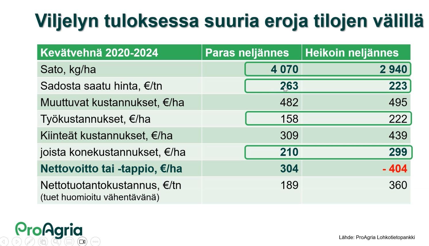 Hintasuhde öljykasveille on edelleen 2,5-kertainen suhteessa viljaan. Muuta viljelystrategiaasi viimeistään tässä vaiheessa pudottamalla epävarmat lohkot pois satokasvien viljelystä. Peltohehtaaria kohden on saatava enemmän viljasatoa, jotta viljely olisi kannattavaa tai edes plussalla. Heikkojen ja parhaan neljänneksen viljelijöillä on hurjia eroja. Ennakkotietojen mukaan vuonna 2025 parhaaseen neljännekseenkään kuuluvilla viljelijöillä on hankaluuksia saavuttaa edes nollataso. Suurin erottava tekijä satotason lisäksi oli kiinteät kustannukset, vaikka myös sadosta saatu hinta, muuttuvat- ja työkustannukset olivat parhaalla neljänneksellä pienemmät kuin heikommalla joukolla.