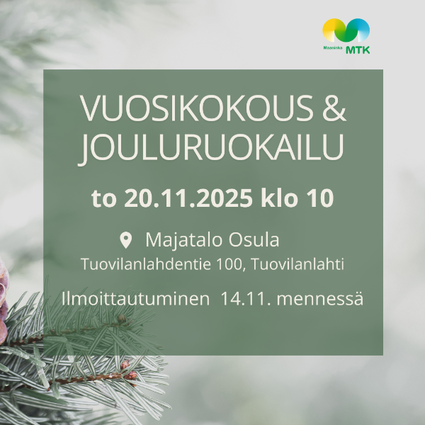 MTK-Maaningan vuosikokous ja jouluruokailu torstaina 20.11.2025 klo 10:00 Majatalo Osulassa (Tuovilanlahdentie 100, Tuovilanlahti).